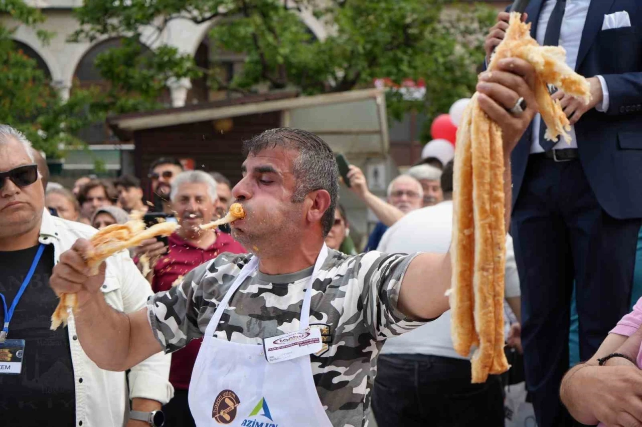 İstanbul’un ardından 14’üncüsü Bursa’da düzenlenen Geleneksel Börek Yeme Yarışması’nda yarışmacılar 5 dakikada 16 metre börek yemek için mücadele etti. İlk 3’e giren 3 yarışmacıda aynı metrede börek yeme başarısını gösterince ’VAR’a gidildi. Hassas terazi ile tartılan böreklerde birinciyi 40 gramlık fark belirledi. 11 metre börek yiyen Ali Kılıç geriye 584 gram en az böreği bırakarak yarışmanın birincisi oldu. Aynı metre börek yiyen bayan yarışmacı Fatma Arslan geriye 624 gram börek bırakarak 2., Uğur Dündar ise bıraktığı 700 gram börekle 3. oldu. Birinci 10 gram altının sahibi oldu.