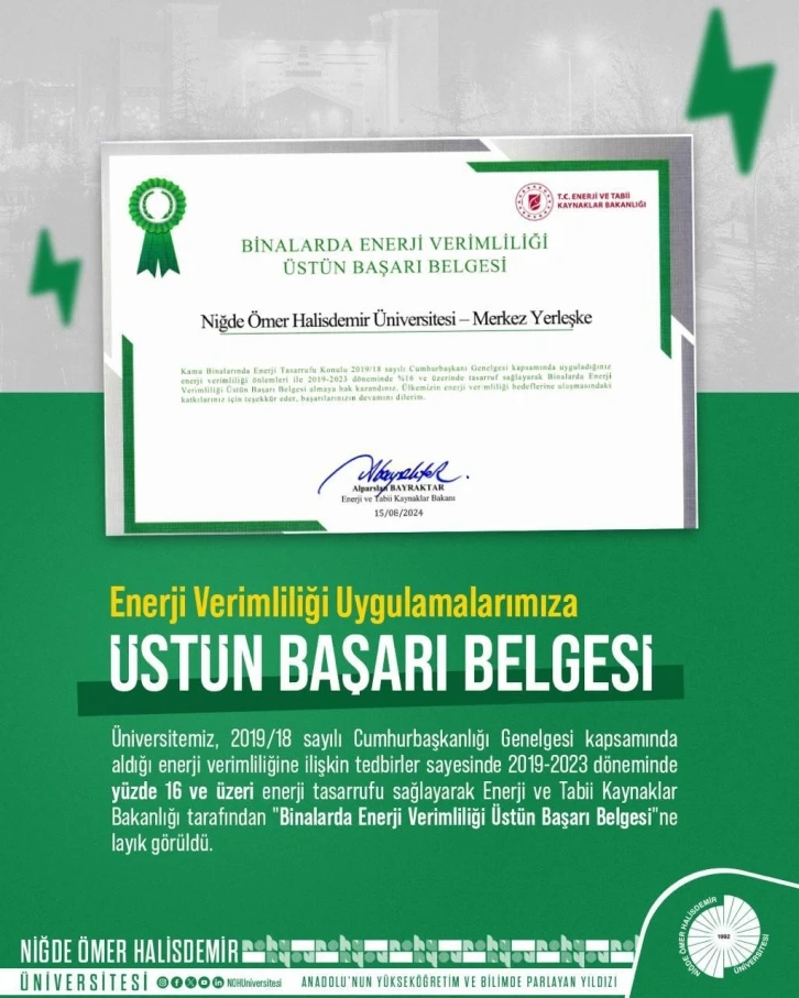 Niğde Ömer Halisdemir Üniversitesi, 2019/18 sayılı Cumhurbaşkanlığı Genelgesi kapsamında aldığı enerji verimliliğine ilişkin tedbirler sayesinde 2019-2023 döneminde yüzde 16 ve üzeri enerji tasarrufu sağlayarak Enerji ve Tabii Kaynaklar Bakanlığı tarafından ’Binalarda Enerji Verimliliği Üstün Başarı Belgesi’ne layık görüldü. Niğde Ömer Halisdemir Üniversitesi özellikle son iki yıldır yaptığı çalışmalarla altyapı eksikliklerini giderme ve yenileme bakımından ısıtma ve soğutma sistemlerine ait boru ve kanallarını ısı kaybını en aza indirecek şekilde geliştirirken, birçok binada ise kazanları yoğuşmalı kazanlarla değiştirdi. Kampüs alanındaki sokak armatürleri yerine led armatürlerinin kullanıldığı üniversitede ayrıca lambalara sensörler de takılarak gereksiz kullanımın önüne geçildi. Yine enerji tasarrufunu optimum düzeye çıkarmak amacıyla üniversitenin Türk Musikisi Devlet Konservatuvarı binasındaki koridor aydınlatmaları ve çeşitli alanlar için darbe anahtarı ve zamanlayıcı otomasyon uygulanarak gruplama yapıldı. Böylece Niğde Ömer Halisdemir Üniversitesi bu ve benzeri uygulamalarla Enerji ve Tabii Kaynaklar Bakanlığı tarafından verilen ’Binalarda Enerji Verimliliği Üstün Başarı Belgesini’ almaya hak kazandı. “Üstün Başarı Belgesi, Birincilik Başarımızı Taçlandırdı”