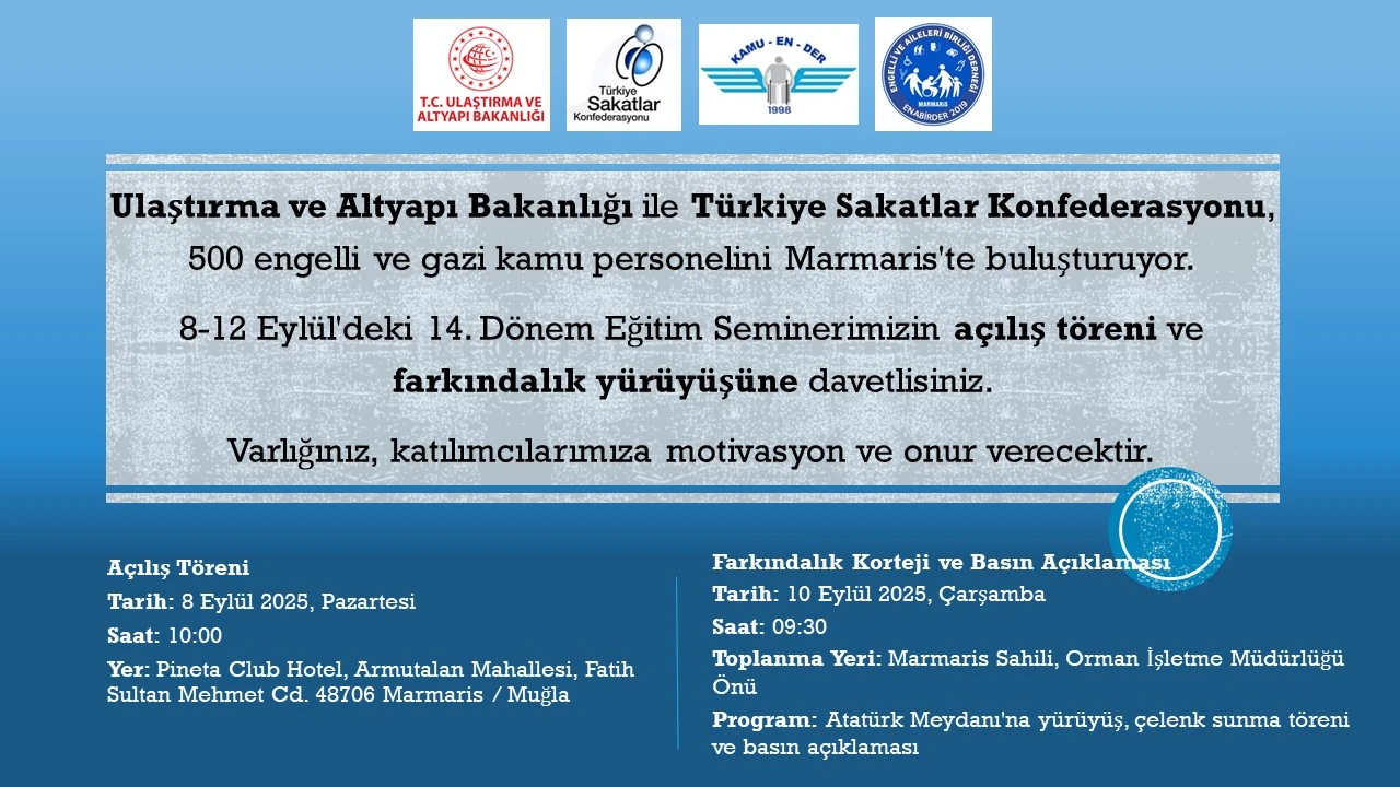 Muğla'nın incisi Marmaris, Ulaştırma ve Altyapı Bakanlığı ile Türkiye Sakatlar Konfederasyonu'nun ortaklaşa düzenlediği anlamlı bir etkinliğe ev sahipliği yapıyor. Bu özel buluşma, Türkiye'nin dört bir yanından gelen 500 engelli ve gazi kamu personelini bir araya getiren 14. Dönem Eğitim Semineri ile başladı.