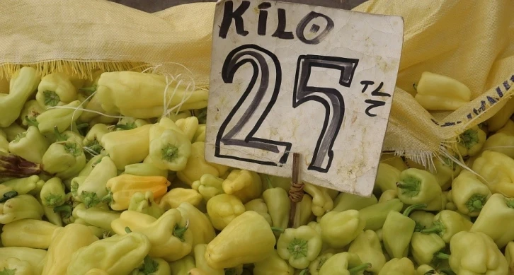 Dolmalık biber kilo 25 TL, kavun tane 20 TL, salatalık kilo 15 TL, domates kilo 15 TL, fasulye 50 TL, marul adet 20 TL, yeşil soğan bağı 15 TL, patates, soğan kilo 15 TL, patlıcan kilo 15 TL.