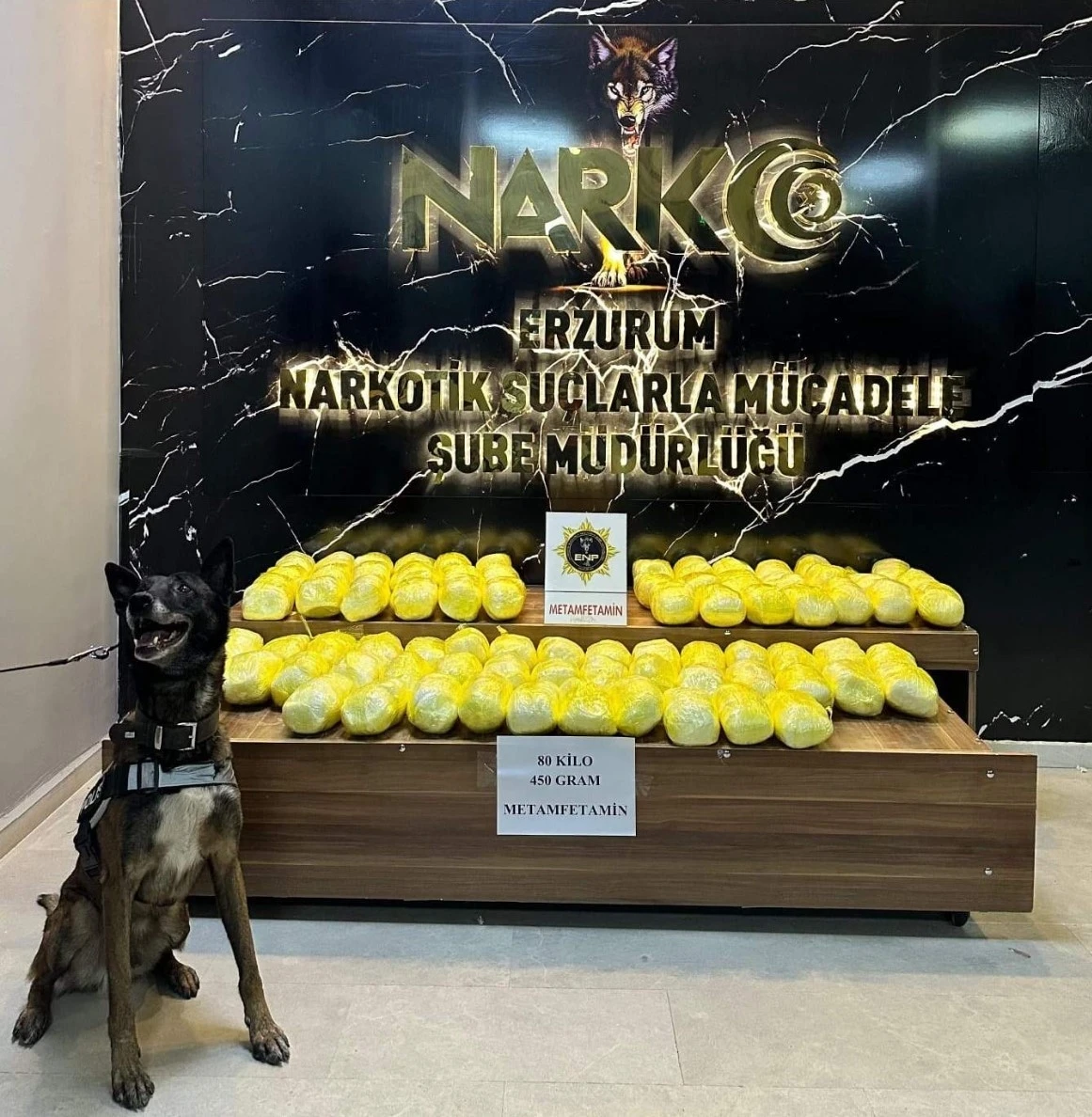 Erzurum Emniyet Müdürlüğü Narkotik Suçlarla Mücadele Şube Müdürlüğü görevlilerince kent genelinde uyuşturucu madde konularına yönelik Narkotik Madde Arama Köpeği Magnum ile yapılan kontroller neticesinde; 80 kilo 450 gram metamfetamin ele geçirildi.