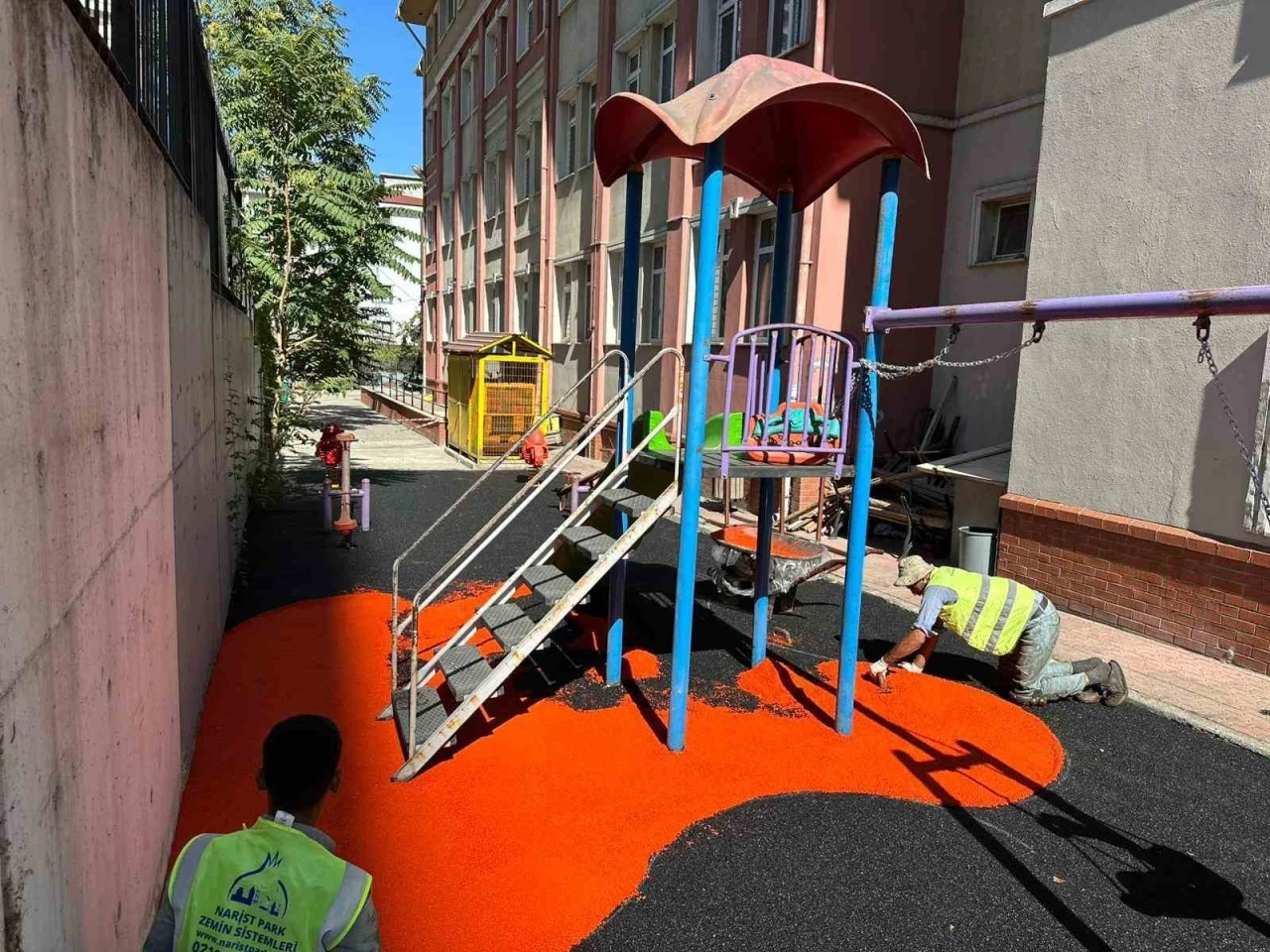Esenyurt Belediyesi, yeni eğitim öğretim dönemi öncesinde çocukların daha konforlu ve güvenli ortamlarda eğitim alabilmesi için devlet okullarında kapsamlı bir çalışma yürütürken, okul bahçelerini de baştan sona yeniliyor. Ekipler, okulların bahçelerine oyun grubu kurulumu yaparak, kauçuk zemin çalışması yapıyor.