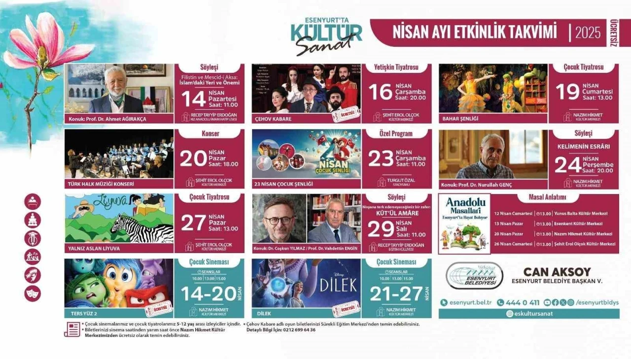 Esenyurt Belediyesi, nisan ayında vatandaşların hem eğlenceli hem de verimli zaman geçirebilmeleri için kültür-sanat programlarını yoğunlaştırdı. Bu kapsamda söyleşilerden tiyatro oyunlarına, şiir dinletilerinden çocuklara özel masal anlatımlarına kadar birçok etkinlik Esenyurtlularla buluşacak. Tüm etkinlikler ücretsiz olarak gerçekleştirilecek ve ilçe sakinlerine dolu dolu bir Nisan ayı yaşatılacak. Söyleşilerle fikir dünyası zenginleşecek