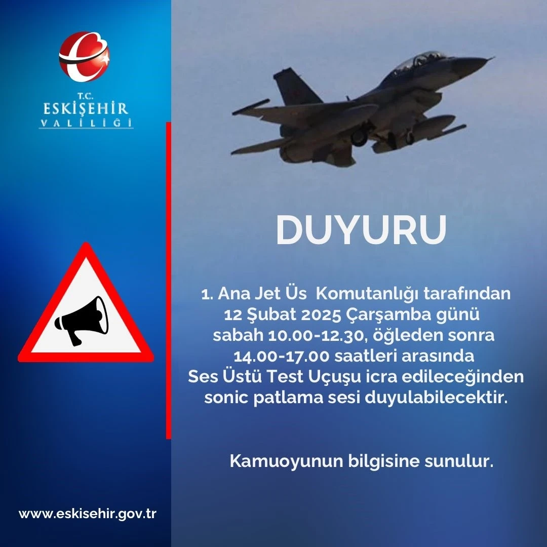 Eskişehir Valiliği, duyuruyu resmi sosyal medya hesapları üzerinden yayımlandı. Açıklamada, 12 Şubat 2025 tarihinde 1. Ana Jet Üs Komutanlığı tarafından 10.00-17.00 saatleri arasında ses üstü test uçuşu gerçekleştirileceği belirtildi. Ayrıca, sonic patlama sesi duyulabileceği konusunda uyarı yapıldı.