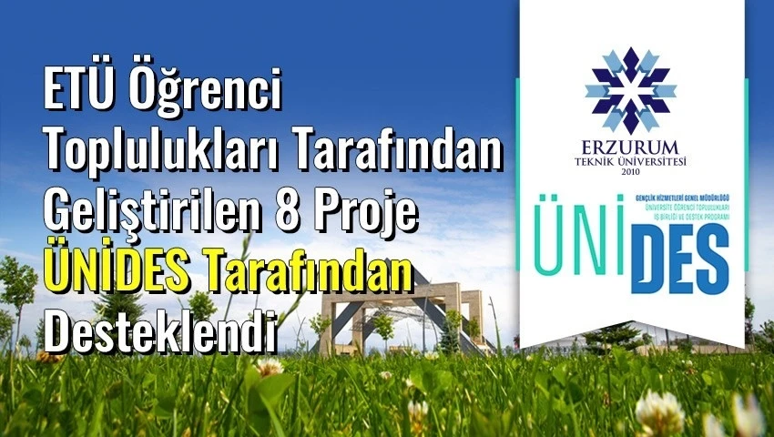 Erzurum Teknik Üniversitesi (ETÜ) öğrenci toplulukları tarafından hazırlanan 8 proje, Üniversite Öğrenci Toplulukları İş Birliği ve Destek Programı (ÜNİDES) tarafından destek almaya hak kazandı.