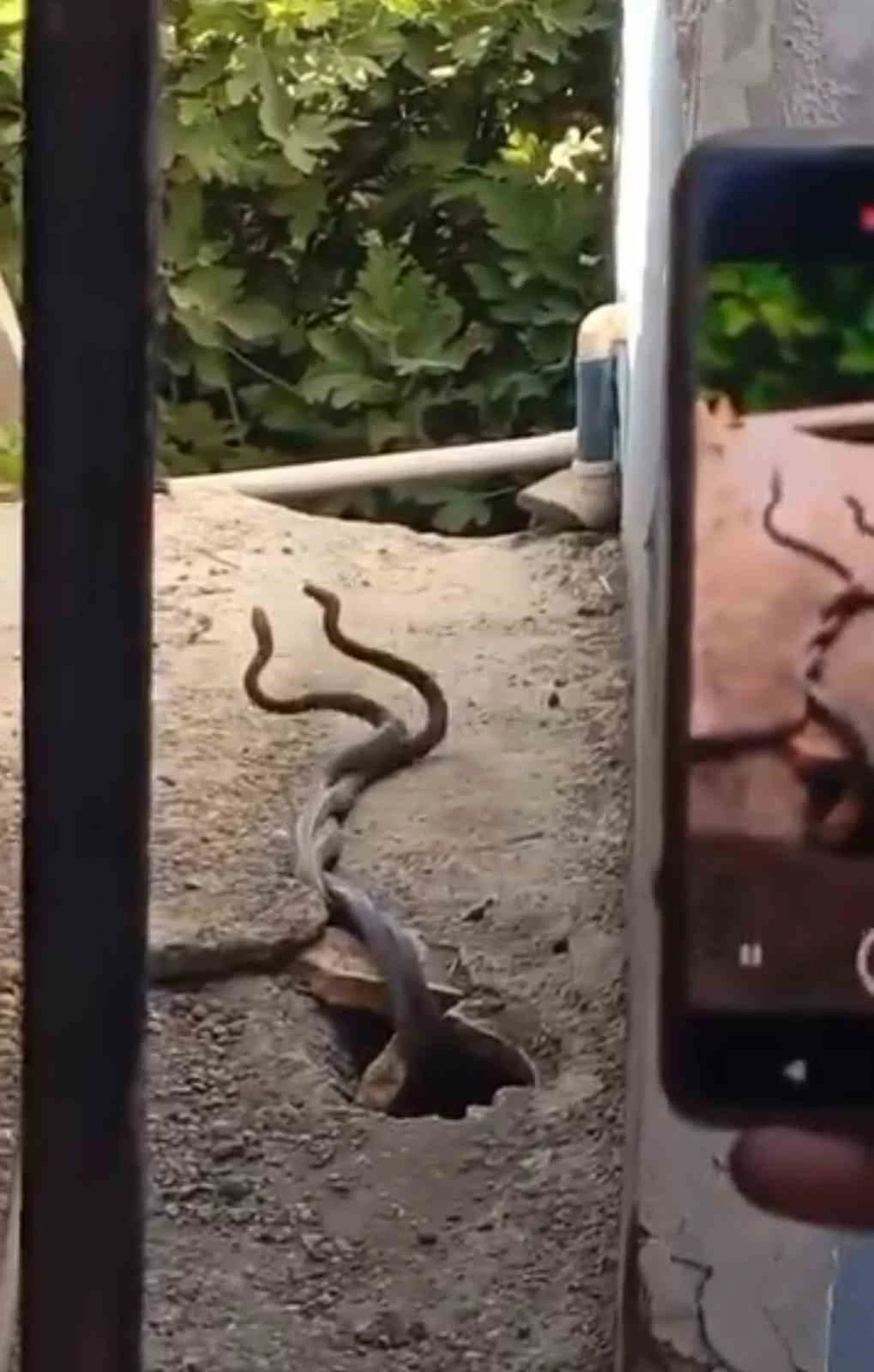 Elazığ’ın Palu ilçesinde bir evin alt katında ortaya çıkan iki yılan paniğe neden oldu. Vatandaş tarafından cep telefonuyla kaydedilen görüntülerde uzunlukları 2 metreyi aşan yılanların bir çukurdan çıktığı ve ilerlediği görülüyor.