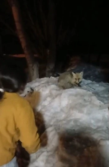 Bayburt’un Demirözü ilçesine bağlı Akyaka köyünde ikamet eden İçlek ailesi evlerinin önüne gelen tilkiyi ekmekle beslediler.