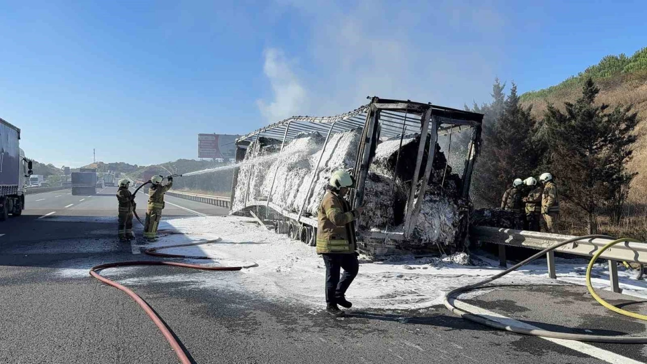 Edinilen bilgiye göre Yavuz Sultan Selim Köprüsü üzerinden Avrupa Yakası’na geçen 59 AJL 460 plakalı kumaş yüklü tır, Eyüpsultan Kuzey Marmara Otoyolu’nda ilerlemeye devam etti. Saat 16.00 sıralarında tırın dorsesinde bilinmeyen bir nedenle yangın çıktı. Dumanı fark eden şoför, tırı güvenlik amacıyla çekici kısmından ayırdı. Çekici yaklaşık 500 metre ileride yol kenarına park edilirken, kumaş yüklü dorse kısa sürede alev topuna döndü. İhbar üzerine olay yerine çok sayıda itfaiye, jandarma ve otoyol ekibi sevk edildi. Yangın nedeniyle otoyolun İstanbul Havalimanı-Edirne istikametinde iki şeridi trafiğe kapatıldı. Yangın ekiplerin yoğun çalışmasıyla kontrol altına alınarak söndürüldü.