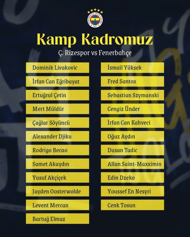 Fenerbahçe’nin Trendyol Süper Lig’in 3. haftasında deplasmanda oynayacağı Çaykur Rizespor maçının kamp kadrosu belli oldu.