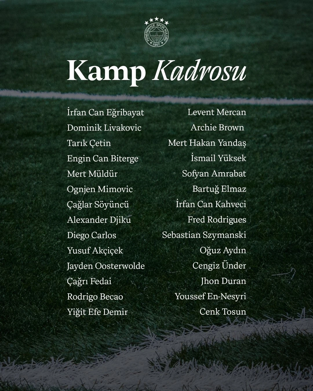 "İrfan Can Eğribayat, Dominik Livakovic, Tarık Çetin, Engin Can Biterge, Mert Müldür, Ognjen Mimovic, Çağlar Söyüncü, Alexander Djiku, Diego Carlos, Yusuf Akçiçek, Jayden Oosterwolde, Çağrı Fedai, Rodrigo Becao, Yiğit Efe Demir, Levent Mercan, Archie Brown, Mert Hakan Yandaş, İsmail Yüksek, Sofyan Amrabat, Bartuğ Elmaz, İrfan Can Kahveci, Fred Rodrigues, Sebastian Szymanski, Oğuz Aydın, Cengiz Ünder, Jhon Duran, Youssef En-Nesyri, Cenk Tosun."