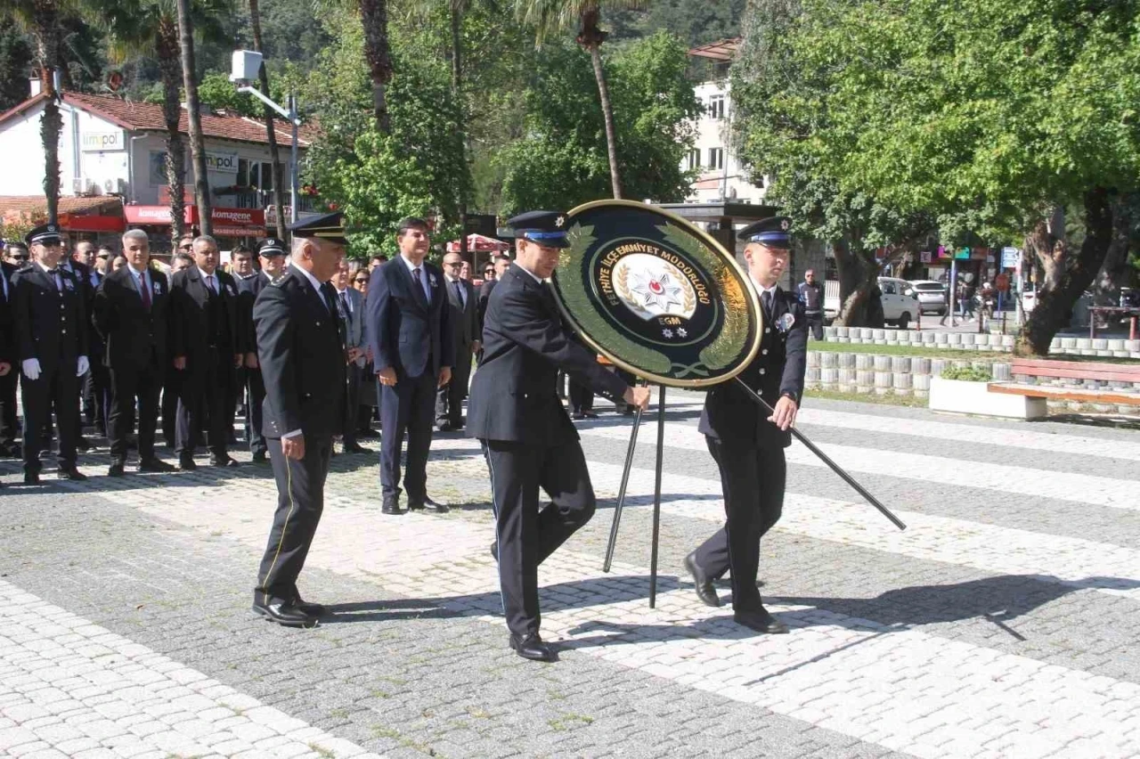 Türk Polis Teşkilatının 180. kuruluş yıl dönümü ve Polis Haftası dolayısıyla Fethiye’de tören gerçekleştirildi. Törende konuşan Fethiye İlçe Emniyet Müdürü Muzaffer Yüceur, "Türk polisi Atatürk ilke ve inkılaplarına bağlı, insan haklarına saygılı, demokratik, laik ve sosyal hukuk devletinin önemli bir kurumu olmanın gururu ve bilinci içerisinde görevini en iyi şekilde yerine getirmeye devam edecektir" dedi. Türk Polis Teşkilatının 180.Kuruluş yıl dönümü Fethiye’de de çeşitli tören ve etkinliklerle kutlanıyor. Fethiye Kaymakamlık Binası Atatürk Anıtı önünde yapılan kutlamaya Fethiye İlçe Emniyet Müdürü Muzaffer Yüceur, İlçe Jandarma Komutanı Mustafa Çiçek, AK Parti İlçe Başkanı Kadir Sarıhan, MHP İlçe Başkanı Abdulkadir Tekin, CHP İlçe Başkanı Mustafa Koyuncu, bazı daire amirleri, polisler, aileleri ve yakınları katıldı. Törende Fethiye İlçe Emniyet Müdürü Muzaffer Yüceur tarafından Atatürk Anıtı’na çelenk sunulmasının ardından Cumhuriyetimizin kurucusu Gazi Mustafa Kemal Atatürk ve tüm şehitlerimiz için 1 dakikalık saygı duruşunda bulunulup, ardından İstiklal Marşımız okundu. Fethiye İlçe Emniyet Müdürü Muzaffer Yüceur, günün anlam ve önemini belirten konuşmasında "Bugün Türk halkının sevgi ve güvenini kazanmış demokratik hukuk devletini Atatürk ilke ve inkılaplarının ve Türkiye Cumhuriyeti’nin teminatı olan Türk Polis Teşkilatı’nın 180.kuruluş yıldönümünü büyük bir gurur ve mutlulukla kutluyor olmanın kıvancı içerisindeyiz. Emniyet teşkilatı toplumda huzuru ve düzeni sağlamak vatandaşın can ve mal güvenliğini koruma kanunun hakimiyetini ve devlet otoritesini sağlama gibi çok önemli ve hayati görevleri üstlenmiştir. Türk polisi Atatürk ilke ve inkılaplarına bağlı, insan haklarına saygılı, demokratik, laik ve sosyal hukuk devletinin önemli bir kurumu olmanın gururu ve bilinci içerisinde görevini en iyi şekilde yerine getirmeye devam edecektir. Teşkilatımızın 180. Kuruluş yıldönümü olan bu günde devletimizin ve milletimizin geleceği uğruna hayatlarını feda eden şehitlerimizin aziz hatıralarını rahmetle anıyor, emekli ve gazilerimiz ile halen görevleri başında olan meslektaşlarımıza ve ailelerine sağlık mutluluk ve başarılar diliyorum" ifadelerini kullandı.