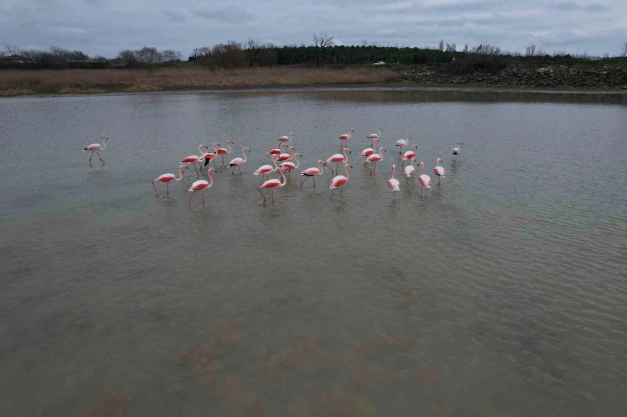 İstanbul’da bulunan Büyükçekmece Gölü, bu kez flamingolara ev sahipliği yaptı. Göl üzerinde süzülen flamingolar, havadan görüntülendi.