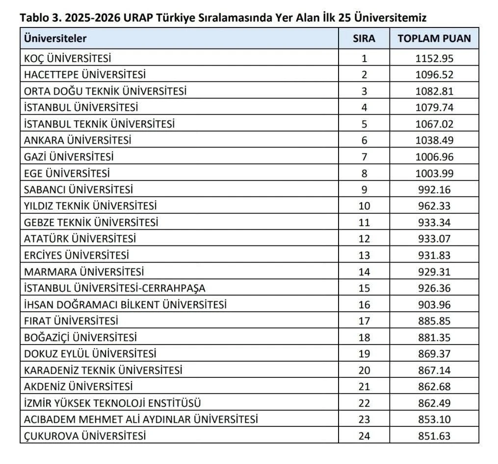 Fırat Üniversitesi (FÜ), University Ranking by Academic Performance (URAP) sonuçlarına göre Türkiye’nin en iyi 17. üniversitesi olurken, devlet üniversiteleri arasında 14. sırada yer aldı. Orta Doğu Teknik Üniversitesi Enformatik Enstitüsü bünyesinde kurulan ve yükseköğretim kurumlarını çeşitli akademik ölçütlere göre değerlendiren bir kuruluş olan URAP (University Ranking by Academic Performance) tarafından yapılan 2025-2026 Türkiye sıralaması açıklandı. Buna göre FÜ, 2025-2026 sıralamasında da 17. sıradaki yerini korumayı başardı. Geçen yıl devlet üniversiteleri arasında 15. sırada yer alan FÜ, bu yıl 14. sırada yer alırken tıp fakültesi bulunan üniversiteler arasında 11. sırada yer aldı.