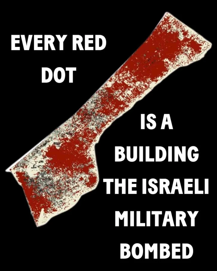 Siyonizm karşıtı örgüt Jewish Voice for Peace (Barış için Yahudi Sesi), BM uydu verilerini kullanarak İsrail’in 7 Ekim’den bu yana Gazze Şeridi’ne attığı 70 binden fazla bombanın haritasını çıkardı. Yapılan paylaşımda, "İsrail ordusu Gazze’nin neredeyse her santimetresini ABD yapımı bombalarla vurdu. İsrail güçleri son 10 ayda Gazze’ye 70 binden fazla bomba attı. Gazze’de İsrail bombardımanının dokunmadığı yer neredeyse kalmadı. Bu harita, İsrail’in Gazze’deki yıkımının büyük boyutunu ortaya koyuyor. Her kırmızı nokta, İsrail kuvvetlerinin 7 Ekim 2023-6 Temmuz 2024 arasında bombaladığı bir binayı gösteriyor. Geçtiğimiz 10 ayda İsrail ordusunun okullar, mülteci kampları, hastaneler, camiler, kiliseler ve belirlenmiş insani yardım bölgeleri dahil olmak üzere Gazze’deki tüm yaşamı kasıtlı olarak hedef aldığına tanık olduk" denildi.