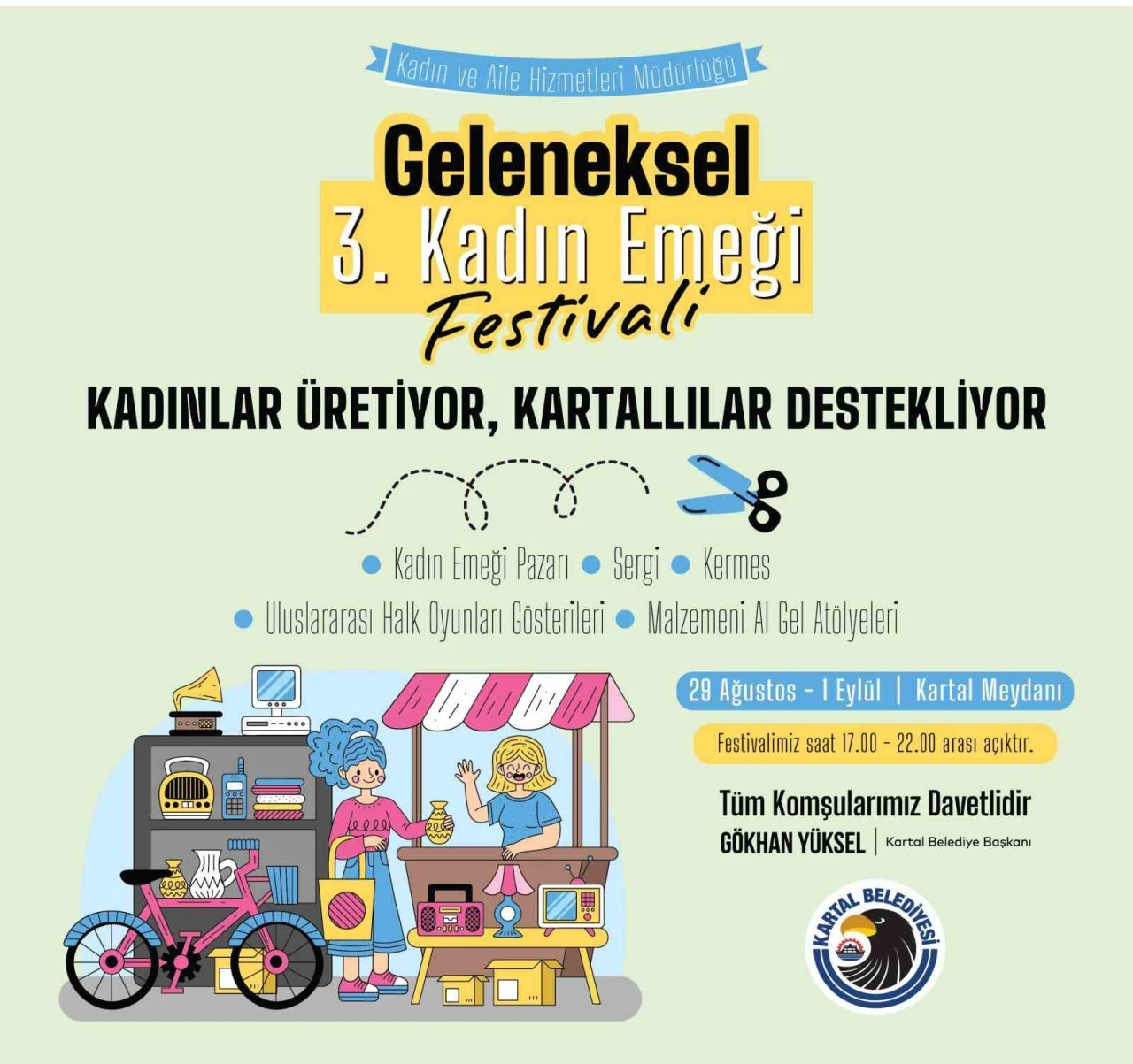 Kartal Belediyesi, Kartallı kadınların el emeği göz nuru ürünlerinin üretimine destek olup sergilemesine imkan sağlamak amacıyla düzenlediği Geleneksel 3’üncü Kadın Emeği Festivali, 29 Ağustos-1 Eylül tarihlerinde ziyaretçilerini ağırlayacak. Kartal Belediyesi, ekonomik ve sosyal hayata dahil olmak amacıyla kadınların iş gücünü desteklemeye devam ediyor. Geleneksel 3’üncü Kadın Emeği Festivali’nde Kadın Emeği Pazarı’nda kadınların ürettiği el yapımı ürünler yer alırken, sergi, hayır panayırı, Uluslararası Halk Oyunları Gösterileri ve Malzemeni Al Gel Atölyeleri de yer alacak. Festivalin açılışı 29 Ağustos Cuma günü saat 17.00’de gerçekleştirilecek. Geleneksel 3’üncü Kadın Emeği Festivali, 29 Ağustos - 1 Eylül tarihlerinde her gün saat 17.00-22.00 saatleri arasında kadar açık kalacak. Kartal Belediye Başkanı Gökhan Yüksel, kadınları her zaman desteklediklerini ve gerek sosyal gerekse ekonomik anlamda yanlarında olduklarını ifade ederek, Geleneksel 3’üncü Kadın Emeği Festivali’ne tüm Kartallı komşularını davet etti.
