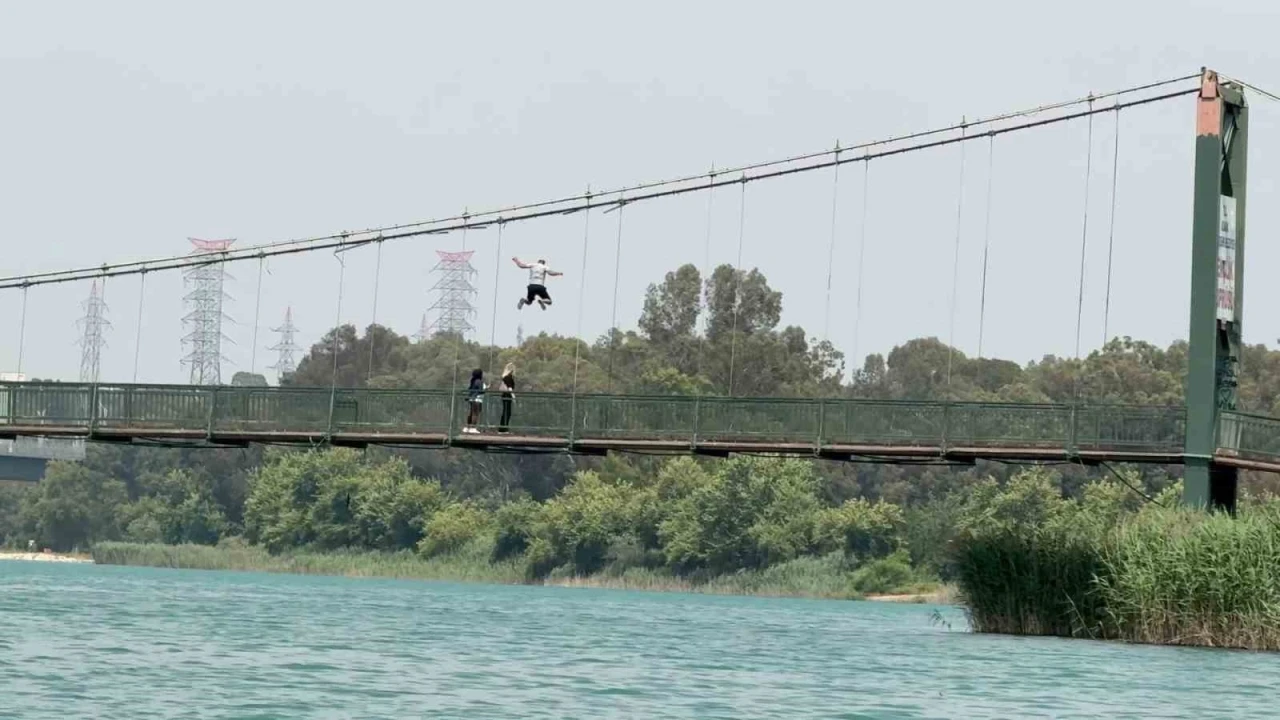 Adana’da etkili olan sıcaklar nedeniyle gençler, serinlemek için Seyhan Nehri üzerindeki Gençlik Köprüsü’nün halatlarına tırmanarak suya atladı. Tehlikeli o anlar ise kameraya yansıdı.