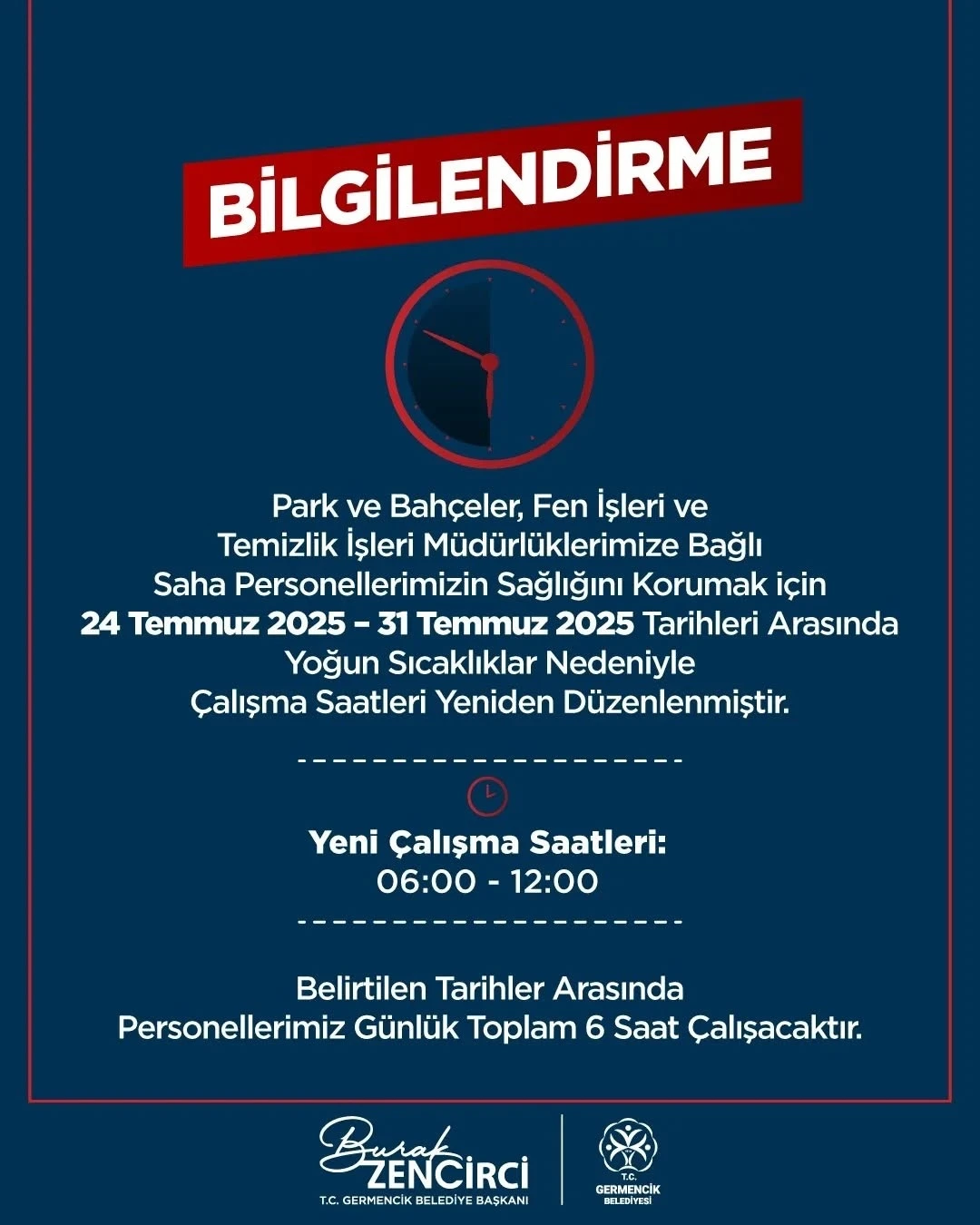 Aydın’ın Germencik ilçesinde etkili olan aşırı sıcaklar nedeniyle, belediye sahada görev yapan personelin sağlığını korumak amacıyla çalışma saatlerinde düzenlemeye giderek, 24-31 Temmuz tarihleri arasında geçerli olacak uygulamada mesainin sabahın serin saatlerinde yapılacağını duyuruldu. Germencik Belediyesi, yaz mevsiminin en sıcak günlerinin yaşandığı şu günlerde personel sağlığını gözeten bir karar vererek, belirli birimlerde çalışan personellerin mesai saatlerinde yeni bir düzenlemeye gitti. Belediye Başkanı Burak Zencirci tarafından yapılan açıklamada, "Her şeyden önce hizmet, hizmetten önce insan sağlığı" vurgusu yapılarak, sıcak havalarda sahada çalışan personelin sağlık riski yaşamaması için düzenlemeye gidildiği belirtildi. Park Bahçeler, Fen İşleri ve Temizlik İşleri Müdürlükleri’ne bağlı saha personellerini kapsayan düzenleme kapsamında çalışma saatleri 24-31 Temmuz 2025 tarihleri arasında 06.00-12.00 olarak belirlendi. Başkan Zencirci açıklamasında, "Aşırı sıcaklar sebebiyle sahada görevli çalışma arkadaşlarımızın sağlığını korumak için belirli bir süre için çalışma saatlerini günün daha serin vakitlerine göre ayarladık. Belirtilen tarihler arasında personellerimiz günlük 6 saat çalışacaktır. İyi çalışmalar dilerim" ifadelerine yer verdi.