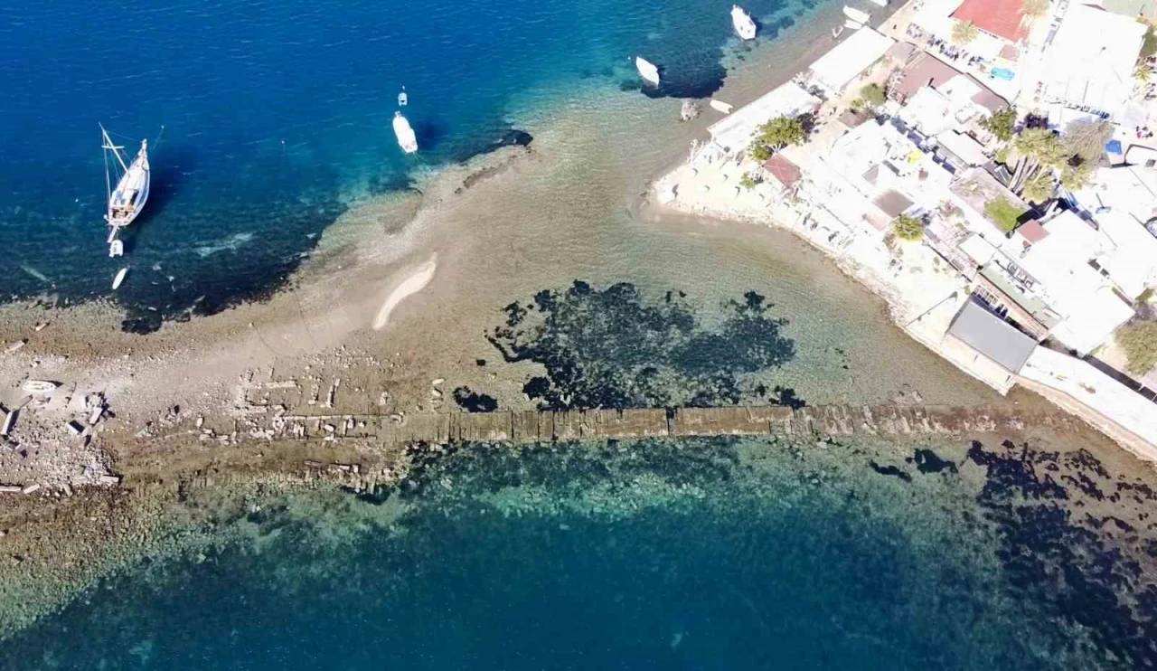 Muğla’nın Bodrum ilçesi Gümüşlük Mahallesi’nde bulunan ve Tavşan Adası’na kadar uzanan tarihi sur yolları, deniz çekilince yeniden ortaya çıktı. Halk arasında ‘Kral Yolu’ olarak bilinen ve 3 bin 500 yıl önce Myndos kentine ulaşımı sağlayan antik yol, dron ile görüntülendi.