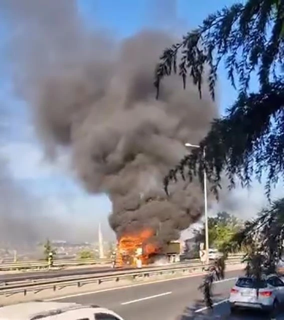 Kocaeli’nin Gebze ilçesinde seyir halindeki hafriyat kamyonu alevlere teslim oldu. Gökyüzünün siyah dumanlarla kaplandığı ve patlamaların olduğu kamyon yangını, itfaiye ekipleri tarafından söndürüldü.
