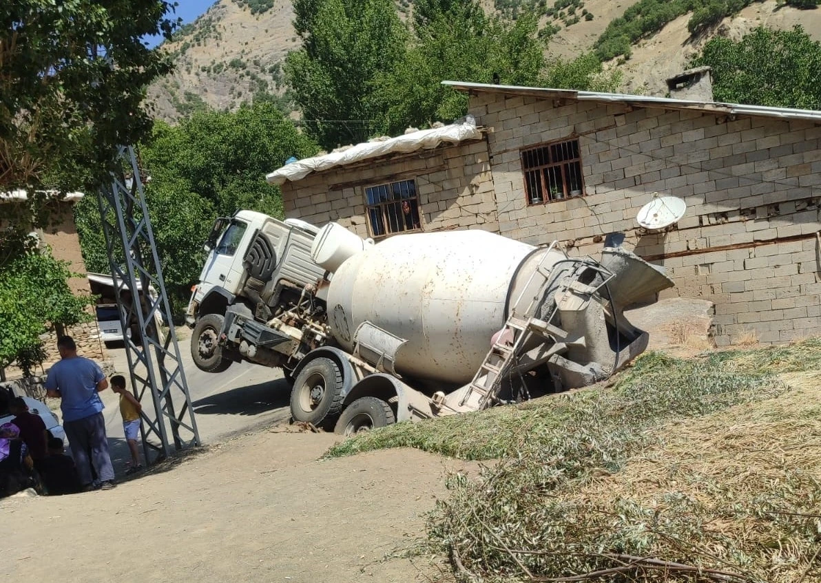 Hakkari’nin Durankaya beldesinde geri manevra yapan bir beton mikseri, bir ahırın üzerine yan yattı.