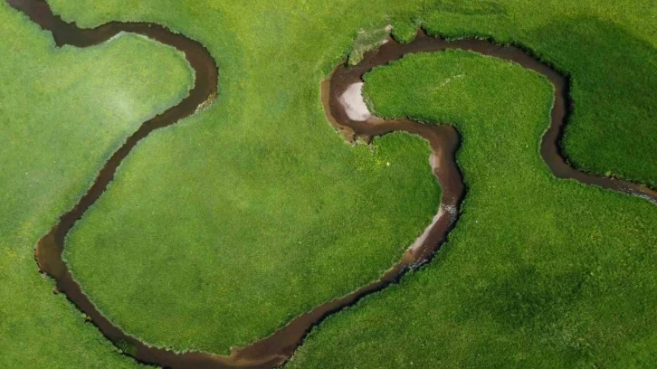 Iğdırın Tuzluca ilçesine bağlı Unbulak yaylası arasında yeşillikler arasında uzayıp giden Unbulak menderesleri havadan dron ile görüntülendi.