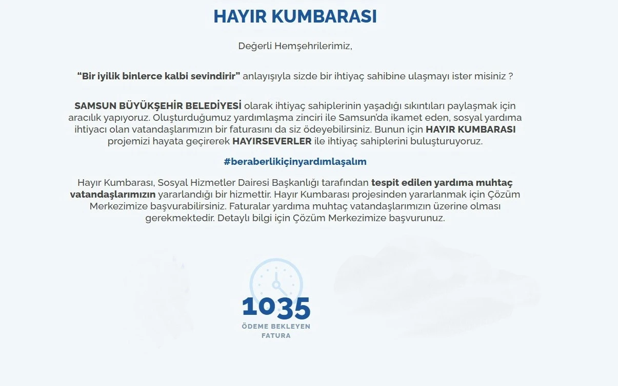 Samsun Büyükşehir Belediyesi, ihtiyaç sahibi vatandaşlarla hayırseverleri bir araya getiren "Hayır Kumbarası" projesiyle sosyal dayanışmayı kurumsal bir zemine taşıyor. Sistem sayesinde hayırseverler, yardıma muhtaç bir ailenin su faturasını on-line olarak ödeyebiliyor.