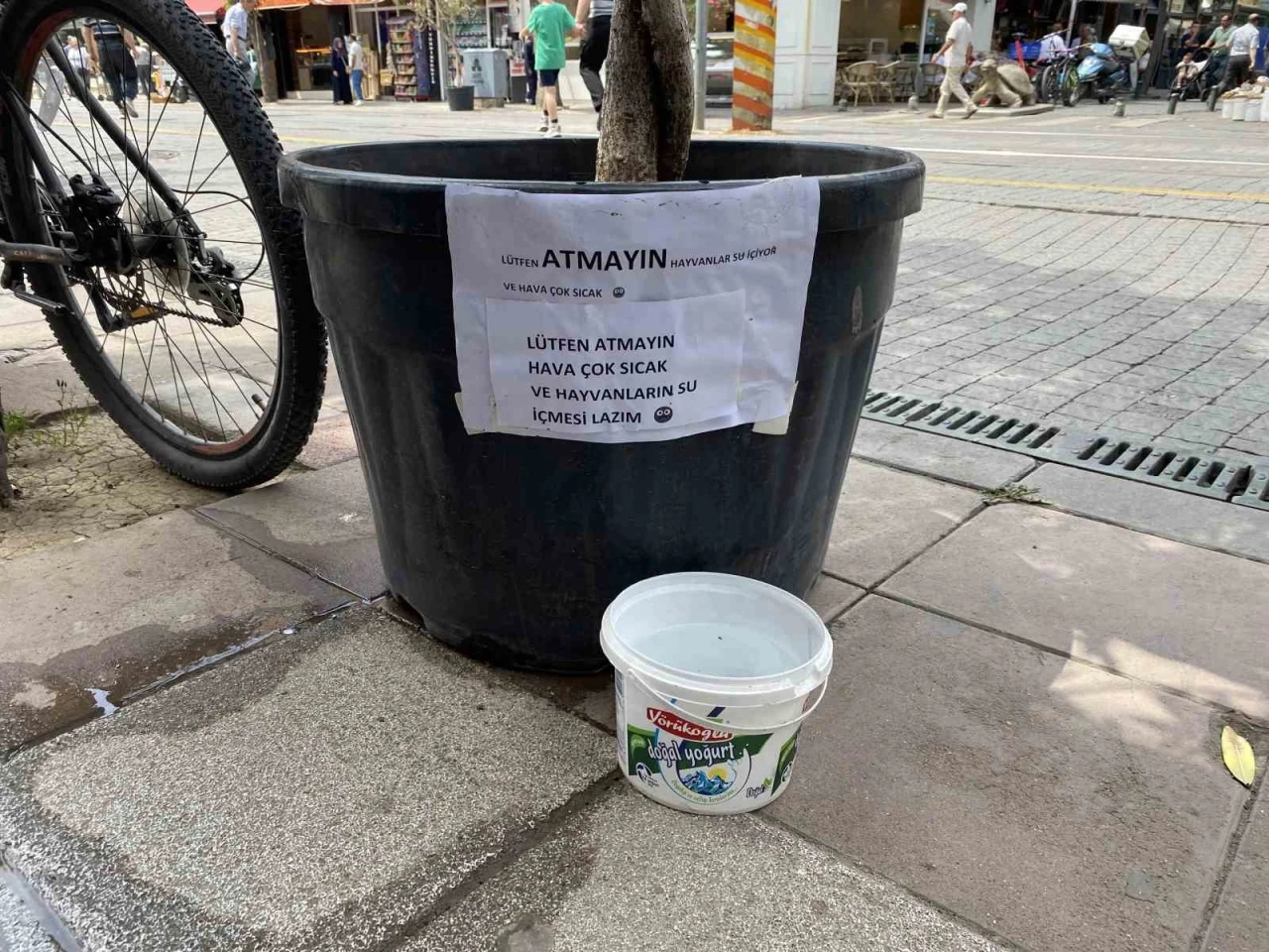 Eskişehir’de hayvansever bir vatandaşı su koyduğu kabın sürekli çöpe atılması nedeniyle bir saksının üzerine astığı, "Lütfen atmayın. Hayvanlar su içiyor ve hava çok sıcak. Hayvanların su içmesi" yazılı kibar uyarısı dikkat çekti.