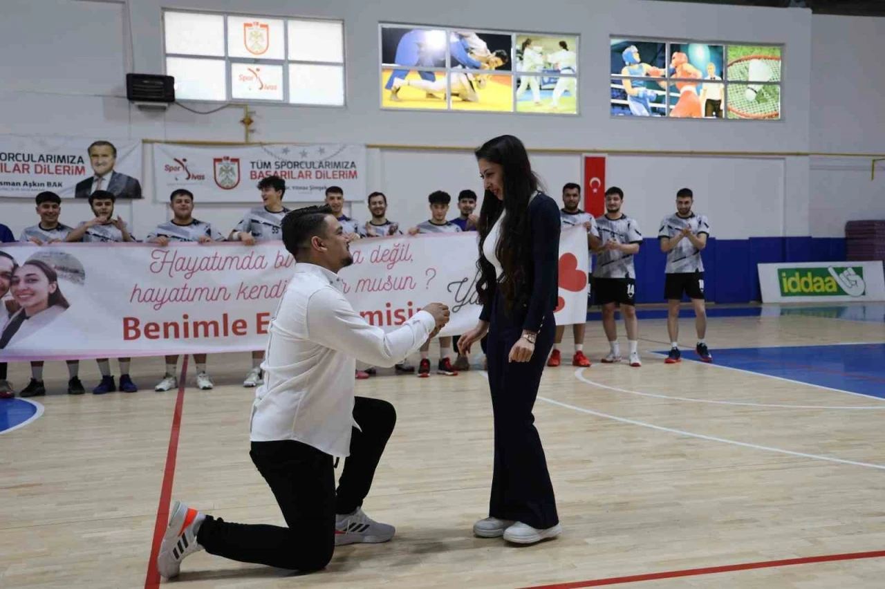 Türkiye Hentbol Erkekler 1. Ligi’nde oynanan Sivas Gençlik Spor Kulübü-Giresunspor karşılaşması unutulmaz bir sürprize sahne olurken, Sivas Gençlik Spor Kulübü’nün yardımcı antrenörü Kürşat Eryıldız, basketbol antrenörü Yaren Kuzucu’ya evlilik teklifi yaptı.