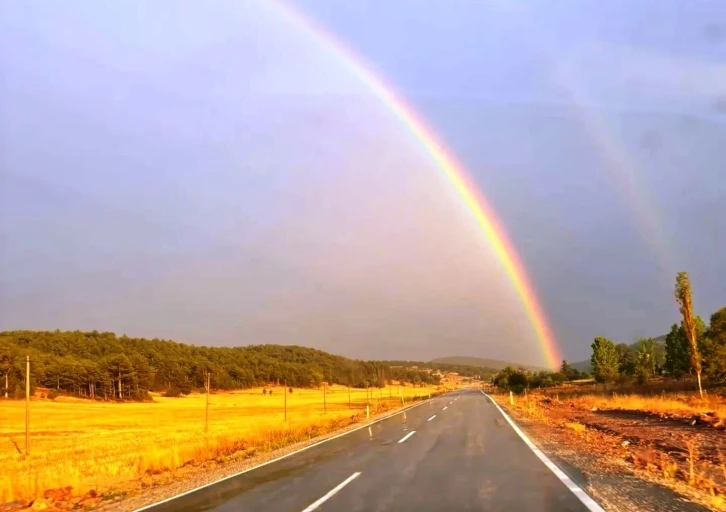 Yağan yağmurun ardından renkli görüntüler oluşturan gökkuşağı, vatandaşların ilgisini çekti. Görüldüğü kısa süre içerisinde etkileyici bir manzara sunan gökkuşağındaki renk cümbüşünü fotoğraflayan vatandaşlar o anları sosyal medya hesaplarından paylaştı. Gökkuşağı görüntüleri sosyal medyada büyük ilgi gördü.