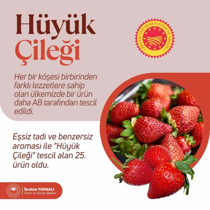 Tarım ve Orman Bakanı İbrahim Yumaklı, Hüyük çileğinin Türkiye’nin Avrupa Birliği’nden (AB) tescil aldığı 25’inci ürünü olduğunu duyurdu.
