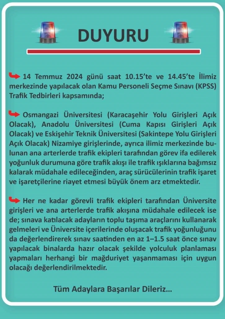 Eskişehir İl Emniyet Müdürlüğü 14 Temmuz 2024 günü saat 10.15’te ve 14.45’te yapılacak olan Kamu Personeli Seçme Sınavı (KPSS) trafik tedbirleri kapsamında duyuru yayımladı. 14 Temmuz 2024 günü saat 10.15’te ve 14.45’te İl merkezinde yapılacak olan Kamu Personeli Seçme Sınavı (KPSS) Trafik Tedbirleri kapsamında yapılan duyuruda şu ifadelere yer verildi; “Osmangazi Üniversitesi (Karacaşehir Yolu Girişleri Açık Olacak), Anadolu Üniversitesi (Cuma Kapısı Girişleri Açık Olacak) ve Eskişehir Teknik Üniversitesi (Sakintepe Yolu Girişleri Açık Olacak) Nizamiye girişlerinde, ayrıca il merkezinde bulunan ana arterlerde trafik ekipleri tarafından görev ifa edilerek edilecek. Yoğunluk durumuna göre trafik akışı ile trafik ışıklarına bağımsız kalarak müdahale edileceğinden, araç sürücülerinin trafik işaret ve işaretçilerine uymaları gerekiyor. Görevli trafik ekipleri tarafından üniversite girişleri ve ana arterlerde trafik akışına müdahale edilecek olsa da; sınava katılacak adayların toplu taşıma araçlarını kullanarak gelmeleri ve üniversite içerilerinde oluşacak trafik yoğunluğunu da değerlendirerek sınav saatinden en az 1-1.5 saat önce sınav yapılacak binalarda hazır olacak şekilde yolculuk planlaması yapmaları herhangi bir mağduriyet yaşanmaması için uygun olacaktır.”