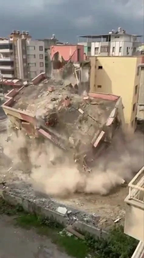 Kahramanmaraş merkezli depremlerde ağır hasar alan Hatay’da, mahkeme süreci tamamlanan binaların yıkım ve enkaz kaldırma çalışmaları hız kesmeden devam ediyor. Bu kapsamda Dörtyol ilçesi Numuneevler Mahallesi’nde bulunan 4 katlı bir bina, kentsel dönüşüm çalışmaları çerçevesinde iş makinesiyle kontrollü şekilde yıkıldı. Yıkım sırasında herhangi bir olumsuzluk yaşanmazken, o anlar cep telefonu kameraları tarafından anbean kaydedildi.