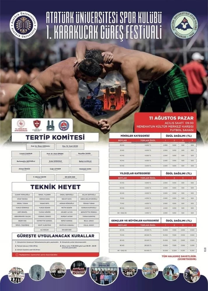 Erzurum’da Atatürk Üniversitesi Spor Kulübü tarafından 11 Ağustos’ta düzenlenecek olan 1. Karakucak Güreş Festivali’nin heyecanı yaşanırken, güreşlere katılacak isimlerde bir bir netleşmeye başladı.
