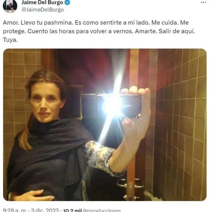 Del Burgo, Kraliçe ile olan ilişkilerine kanıt olarak ise sosyal medya hesabından Kraliçe’nin kendisine gönderdiğini iddia ettiği bir fotoğrafı gösterdi. Del Burgo, siyah bir şala sarılı Letizia’nın fotoğrafını paylaşarak, şalı Kraliçeye kendisinin hediye ettiğini savundu. Paylaşımda Letizia’nın kendisine mesaj da yazdığını iddia eden Del Burgo, “Aşkım. Senin şalına sarındım. Bu bana sen benim yanımdaymışsın gibi hissettiriyor. Beni koruyor. Birbirimizi yeniden görünceye kadar geçen saatleri sayıyorum. Seni seviyorum” mesajını da yayınladı. Paylaşımının ardından sosyal medya kullanıcılarının sorularına maruz kalan Del Burgo, daha fazla mesaj olduğunu dile getirdi.
