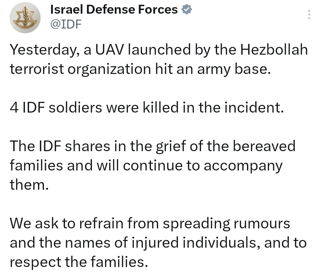 İsrail Savunma Kuvvetleri’nden (IDF) yapılan açıklamada, Hizbullah’ın bir askeri üssü insansız hava aracı ile vurması sonucu 4 İsrail askerinin hayatını kaybettiği bildirildi.