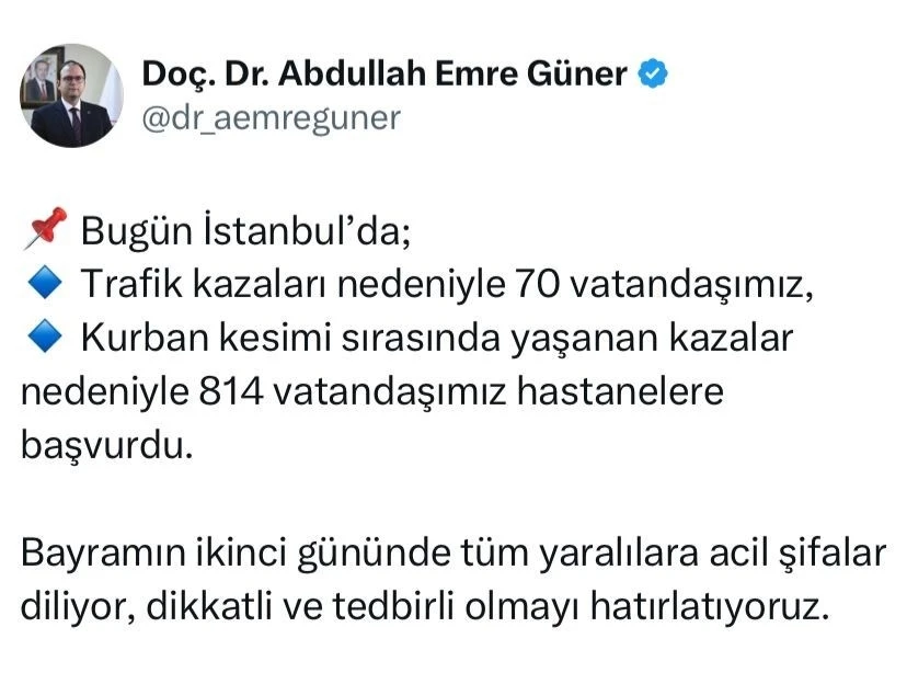 İstanbul İl Sağlık Müdürü Doç. Dr. Abdullah Emre Güner sosyal medya hesabından yaptığı açıklamada, "Bugün İstanbul’da, trafik kazaları nedeniyle 70 vatandaşımız, kurban kesimi sırasında yaşanan kazalar nedeniyle 814 vatandaşımız hastanelere başvurdu. Bayramın ikinci gününde tüm yaralılara acil şifalar diliyor, dikkatli ve tedbirli olmayı hatırlatıyoruz" dedi.