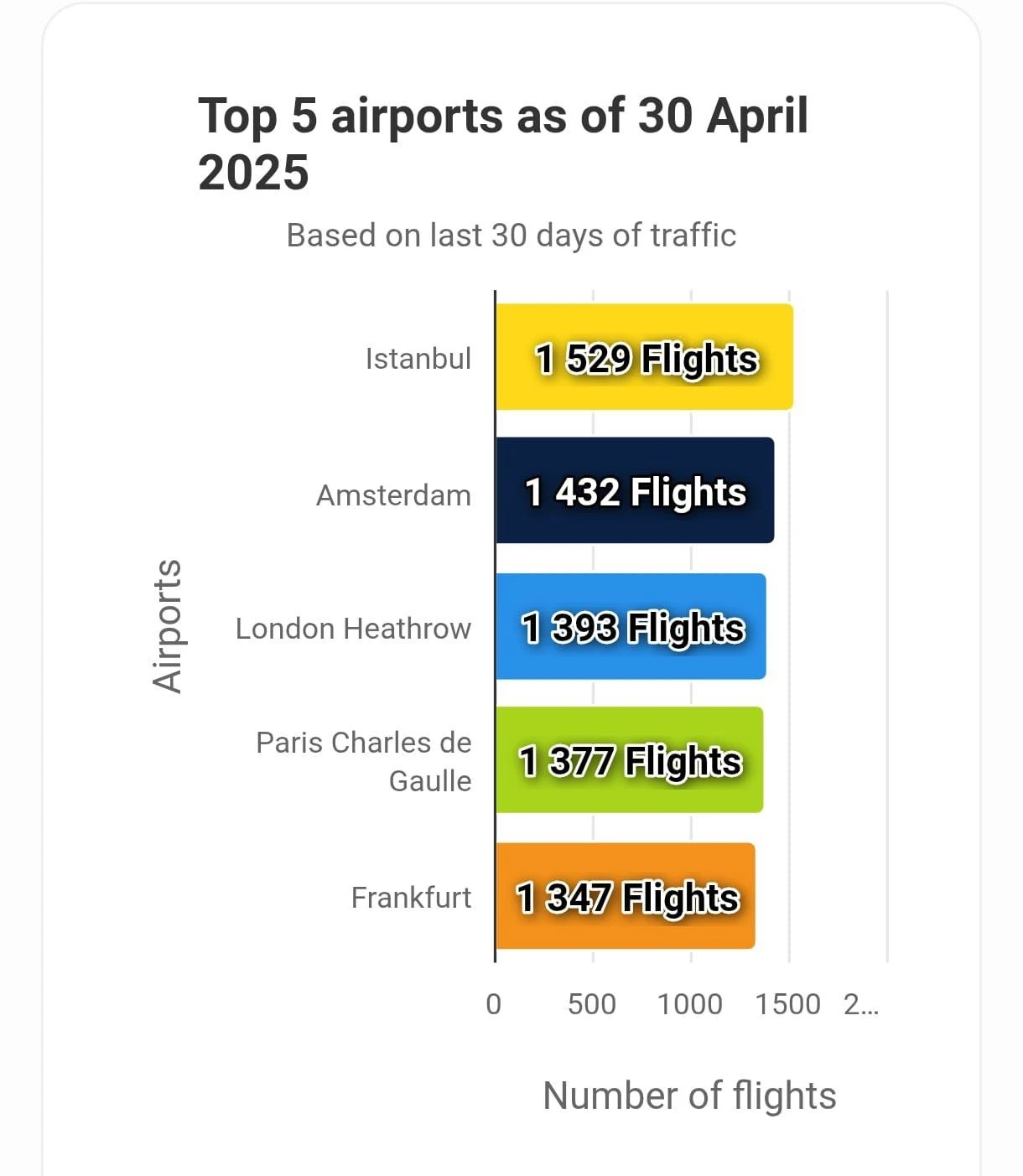 Avrupa Hava Seyrüsefer Güvenliği Teşkilatı (EUROCONTROL) tarafından yayımlanan ‘Avrupa Havacılık Raporu’na göre, İstanbul Havalimanı Avrupa’daki diğer büyük havalimanlarını geride bırakarak nisan ayında lider konumda yer aldı. İkinci sırada bin 432 uçuşla Amsterdam Schiphol, üçüncü sırada bin 393 uçuşla Londra Heathrow, dördüncü sırada bin 377 uçuşla Paris Charles De Gaulle yer alırken, bin 347 uçuşla Frankfurt Havalimanı beşinci sırada yerini aldı.