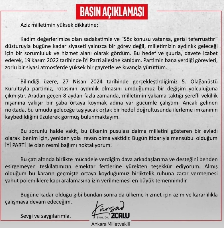 İYİ Parti Sözcüsü ve Ankara Milletvekili Kürşad Zorlu sosyal medya hesabından yaptığı açıklamada, "Aziz Milletimin yüksek dikkatine; kadim değerlerimize olan sadakatimle ve ’söz konusu vatansa gerisi teferruattır’ düsturuyla bugüne kadar siyaseti yalnızca bir görev değil, milletimizin aydınlık geleceği için bir sorumluluk ve hizmet alanı olarak gördüm. Bu hedef ve şuurla davete icabet ederek, 19 Kasım 2022 tarihinde İYİ Parti ailesine katıldım. Partimin bana verdiği görevleri zorlu bir siyasi atmosferde yüksek bir gayretle ve kıvançla yürüttüm. Bilindiği üzere 27 Nisan 2024 tarihinde gerçekleştirdiğimiz 5. Olağanüstü Kurultayla partimiz, rotasının aydınlık olmasını umduğumuz bir değişim yolculuğuna çıkmıştır. Aradan geçen 8 aydan fazla zamanda milletimin yakama taktığı şerefli vekillik nişanına yakışır bir çaba ortaya koymak adına var gücümle çalıştım. Ancak gelinen noktada bu umudu geleceğe taşıyacak ortak bir hedef doğrultusunda ilerleme imkanının kaybedildiğini üzülerek görmüş bulunmaktayım. Bu zorunlu halde vakit, bu ülkenin pusulası daima milletini gösteren bir evladı olarak benim için yeniden yola revan olma vaktidir. Bugün itibarıyla mensubu olduğum İYİ Parti ile olan resmi bağımı noktalıyorum. Bu çatı altında birlikte mücadele verdiğim dava arkadaşlarıma ve desteğini benden esirgemeyen teşkilatımızın emektar fertlerine yürekten teşekkür ediyorum. Almış olduğum bu kararın geçmişte ortaya koyduğumuz birliktelik ruhuna zarar vermemesi yahut polemiklere kapı aralamasına izin verilmemesi en büyük temennimdir. Bugüne kadar olduğu gibi bundan sonra da ülkeme hizmet için azim ve kararlılıkla çalışmaya devam edeceğim" dedi.