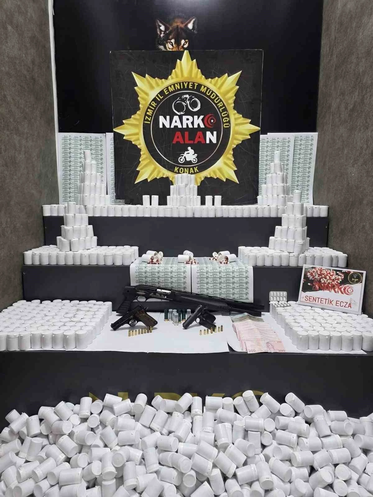 Edinilen bilgiye göre, İl Emniyet Müdürlüğü Konak İlçe Emniyet Müdürlüğüne bağlı Narkotik Suçlarla Mücadele (NARKO ALAN) ekipleri, uyuşturucu madde ticaretinin önlenmesine yönelik çalışmalarını sürdürüyor. Ekipler, 6 Ocak günü Hilal Mahallesi’nde uyuşturucu madde depolandığı ve ticaretinin yapıldığı belirlenen adreslere operasyon düzenledi. Adreslerde yapılan aramalarda 108 bin 472 adet sentetik ecza, 1 adet pompalı tüfek ve tüfeğe ait 9 adet dolu kartuş, 2 adet ruhsatsız tabanca, şarjörler ve çok sayıda fişek ile suçtan elde edildiği değerlendirilen 75 bin 100 TL nakit para ele geçirildi. Operasyonda N.P. (28), F.B. (29) ve N.K. (41) isimli 3 şüpheli yakalanarak gözaltına alındı. Yapılan sorgulamada şüphelilerden birinin kesinleşmiş hapis cezası ile arandığı tespit edildi. Şüpheliler hakkında adli işlem başlatıldığı öğrenildi.