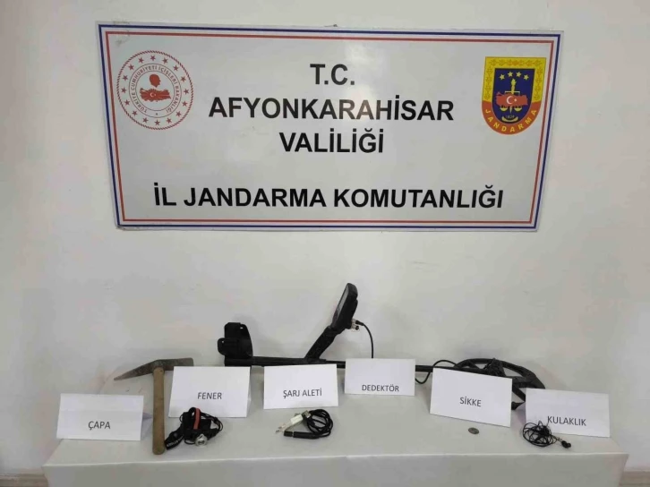 Afyonkarahisar’da kullandığı araçla devriye gezen jandarma ekiplerini görünce kaçan şahıs tarihi eser niteliğindeki sikke ve define arama malzemeleri ile yakalandı.