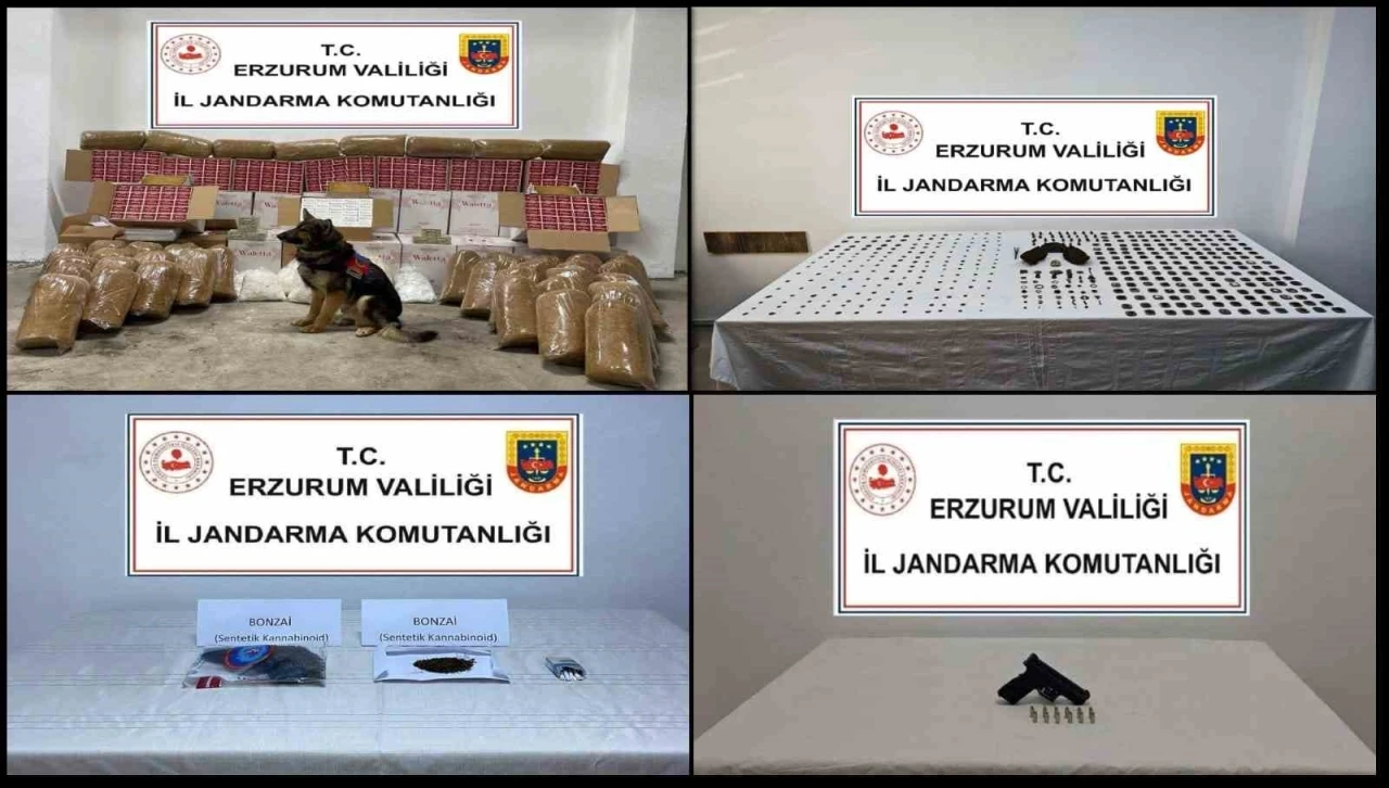 Erzurum İl Jandarma Komutanlığınca 01-31 Ocak 2025 tarihleri arasında kaçakçılık ve organize suçların önlenmesine yönelik sürdürülen çalışmalar kapsamında; 35 gram metamfetamin, 56 gram bonzai,10 gram bonzai hammaddesi,22 gram toz esrar, 4 gram eroin, 3 adet lyrıca,1 adet ruhsatsız tabanca, 2 adet tabanca şarjörü ve 21 adet fişek, 194 adet tarihi sikke, 272 adet eski eser niteliğinde süs eşyası, 3 adet dedektör, 235 kg kaçak tütün, 18 bin 192 adet sigara kağıdı, 44 bin 950 adet sigara filtresi, 456 bin 200 adet makaron, bin 376 paket sigara ele geçirildi.