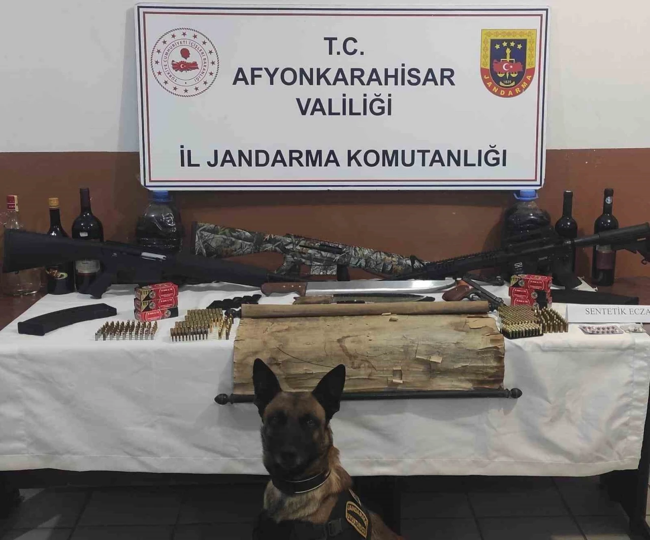 Afyonkarahisar İl Jandarma Komutanlığı ekipleri Sinanpaşa İlçesi Tınaztepe Beldesinde faaliyet gösteren bir işletmede uyuşturucu ve kaçak alkol bulundurdukları yönünde bilgi aldı. Bunun üzerine, Jandarma Suç Araştırma Dedektiflerince (JASAT) söz konusu işletme sahibinin ev ve eklentilerine bakın yapıldı. Adreslerde arama yapan ekipler 17 adet sentetik ecza, ruhsatsız tabanca, 3 ruhsatsız tüfek, tarihi eser niteliği taşıyan harita, 16 litre sahte, kaçak alkol 3 adet bıçak ve 532 mermi ele geçirildi. Olayın ardından gözaltına alınan T.A., B.M., N.A. ve U.A. isimli şahıslar ifadeleri alındıktan sonra serbest bırakılırken, ayrıca işletmede yapılan kimlik kontrolünde ikamet izni sona erdiği tespit edilen B.A. isimli İran uyruklu kadına 32 bin 864 TL idari para cezası uygulanıp, Afyonkarahisar İl Göç İdaresi Müdürlüğüne teslim edildiği bildirildi.