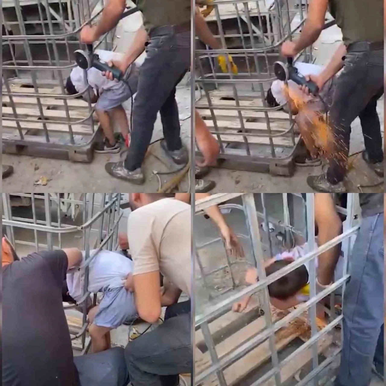 Adana’da bir iş yerinin malzeme taşıma kafesinin parmaklıklarına sıkışan çocuk, demir kesilerek kurtarıldı.