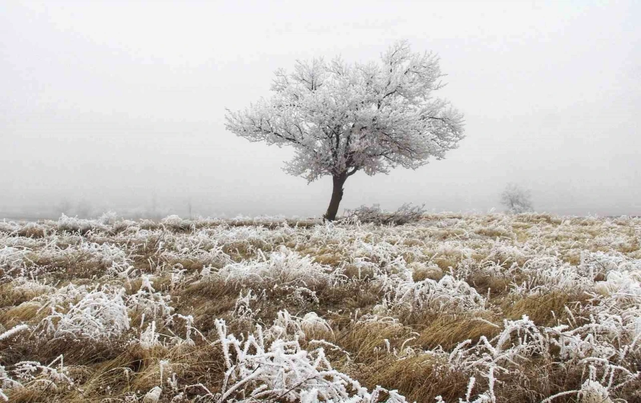 Kahramanmaraş’ta kırağıdan dolayı ağaçlar beyaza büründü.