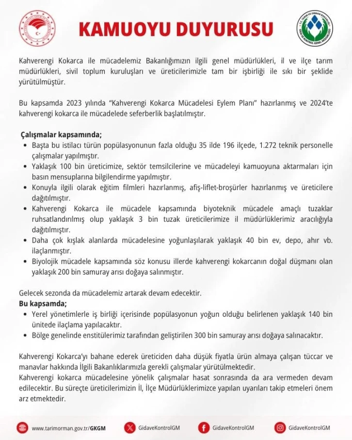 Tarım ve Orman Bakanlığının ilgili kuruluşu Gıda ve Kontrol Genel Müdürlüğünden yapılan açıklamada, kahverengi kokarca ile mücadele için popülasyonun yoğun olduğu yerlerdeki 140 bin ünitede ilaçlama yapılacağı ve 300 bin samuray arısının da doğaya salınacağı ifade edildi.