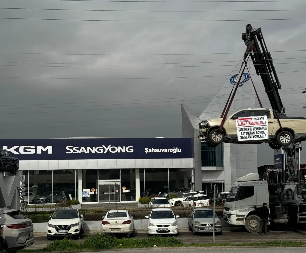 İddiaya göre, bir firma 2024 yılının Mart ayında SsangYong’un sıfır kilometre kamyonetini satın aldı. Şirketin sahibi, 100 bin kilometreye kadar ücretsiz bakım olduğu için en son 94 bin kilometrede araca bakım yaptırdı. Yapılan bakımda motor kısmında da herhangi bir sorun görülmedi. Ancak araç 101 bin kilometreye geldiğinde motor arızası verdi. Kamyonet firmaya tamire götürüldüğünde motorunun tamamen çalışamaz halde olduğu bilgisi verildi. Firma aracın 6 bin kilometre önce bakıma getirildiğini ancak herhangi bir arızasının çıkmadığını, bu nedenle motorda meydana gelen arızada firmanın kusurlu olduğunu ileri sürerek yapılmasını ya da yeni motor verilmesini talep etti. Ancak SsangYong firması bu durumu kabul etmedi. Bunun üzerine aracı satın aldığı Kavaklı Mahallesi Turhan Cemal Beriker Bulvarı’ndaki SsangYong araç bayisine gelen firma yetkilileri, kamyoneti vinçle asarak eylem yaptı. Vatandaşlar, aracın üzerine de "Alma, kandırılma. Satarken gösterilen memnuniyet, satıştan sonra sağlanmıyor" yazılı pankart asarak sergiledi. Bir süre sonra eylem sonlandırıldı.