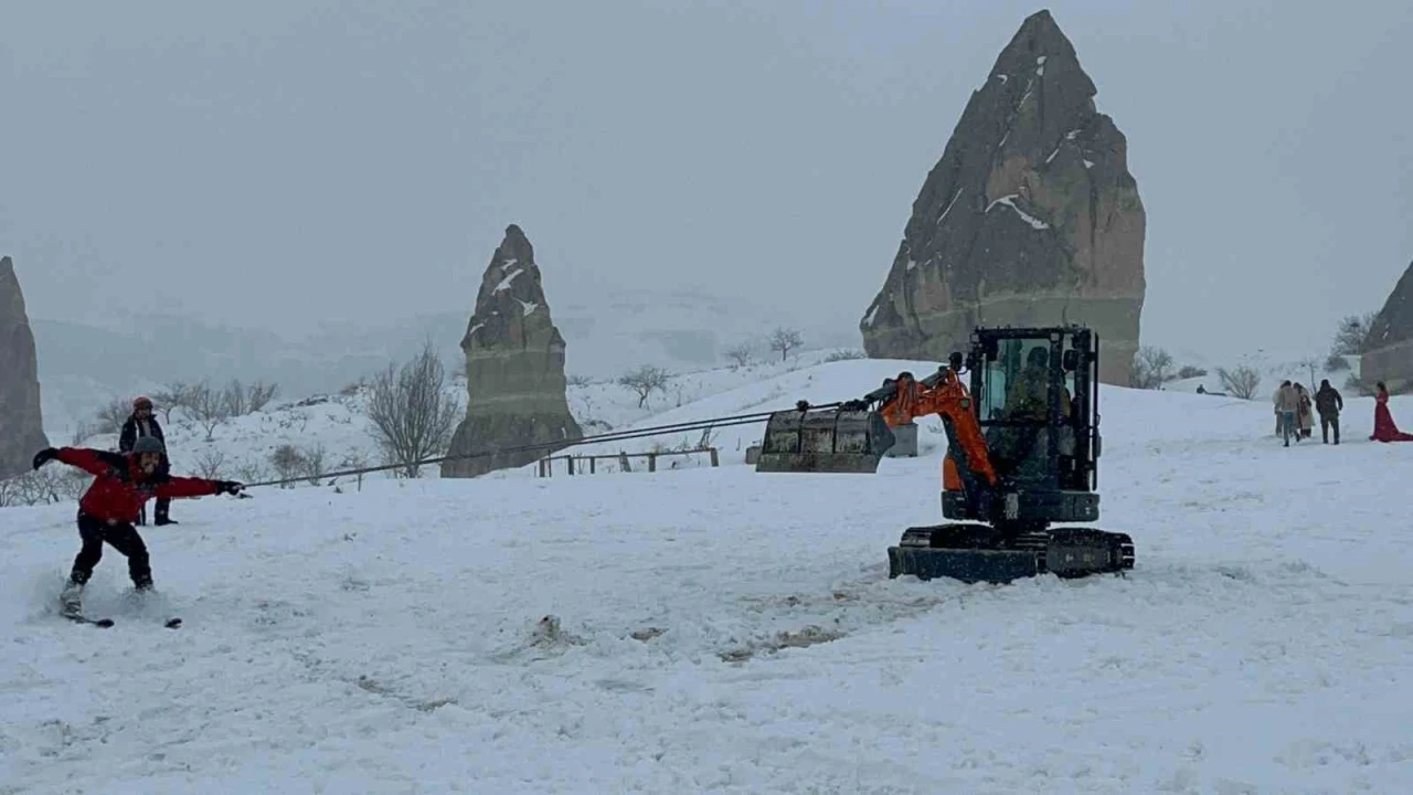 örtü ile kaplanan Kapadokya bölgesinde bir araya gelen sporcular hem karın hem de manzaranın tadını çıkarttı. Kapadokya Enduro Spor Kulübü üyeleri, merkeze bağlı Göreme beldesindeki sıcak hava balon kalkış alanında ATV araçlarına bağladıkları halatlarla kayak yaptı. İşi daha da çılgın hale getiren sporcular, iş makinesine bağladıkları iple 360 derece dönerek kaymanın keyfini yaşadı.