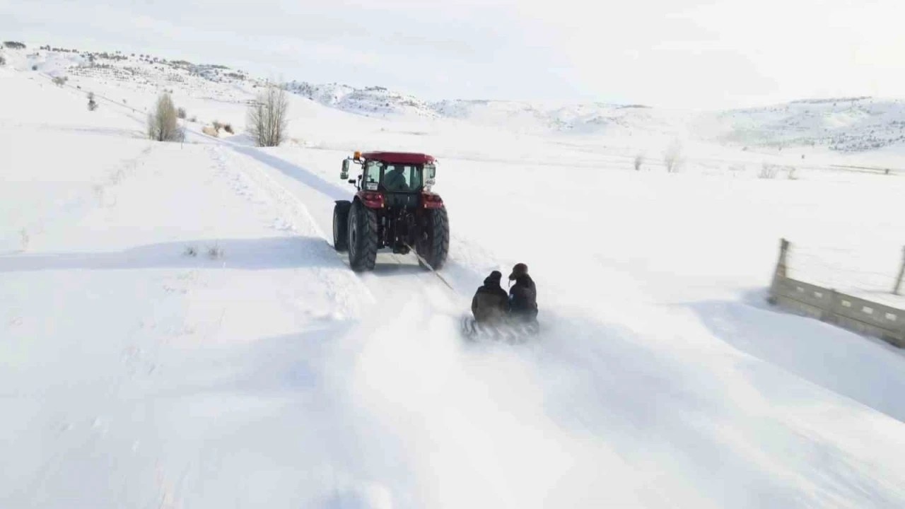 Sivas’ta yoğun kar yağışını eğlenceye dönüştüren bir vatandaş, traktöre bağladığı lastikle köy sokaklarında kayarak gezdi. O anlar aksiyon kamerası ve dron ile kaydedilirken, ortaya renkli görüntüler çıktı.