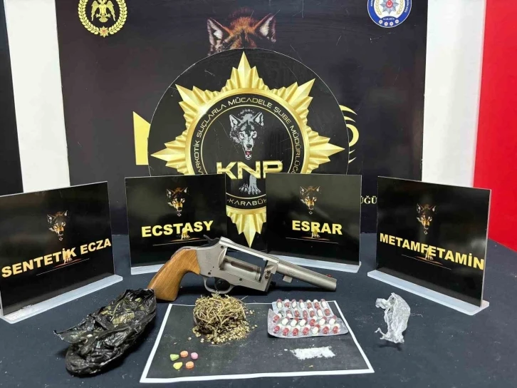 İl genelinde yapılan çalışmalarda S.Ö, Y.U, G.K, ve T.K isimli şahısların bulunduğu araçta yapılan aramada; 19.22 gram esrar, 2.11 gram metamfetamin, 27 adet sentetik ecza, 5 adet ekstazi maddesi ile bir adet silah ele geçirildi.