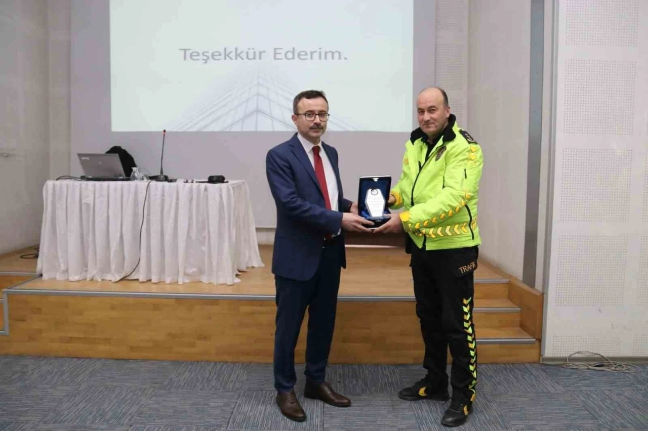 Programın sonunda, Karabük İl Emniyet Müdür Yardımcısı Aydemir Şahin, Dr. Öğr. Üyesi Ali Osman Yılmaz’a değerli katkılarından dolayı teşekkür ederek bir plaket takdim etti.